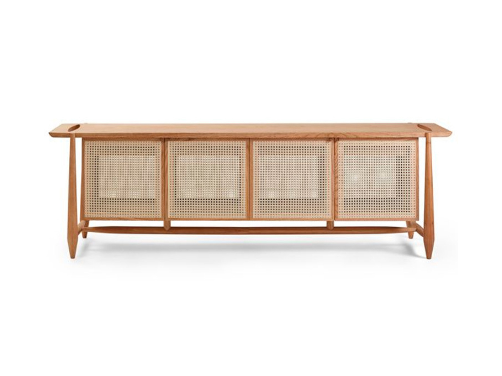 A estética do mobiliário do movimento Branco.Preto foi traduzida para um desenho contemporâneo, pelas mãos das designers da Plataforma4. A peça tem estrutura delgada em madeira maciça torneada, sistema construtivo aparente com volume principal suspenso e fechamento em palhinha, o que garante sua leveza. Um móvel atemporal, brasileiro e de presença marcante.
