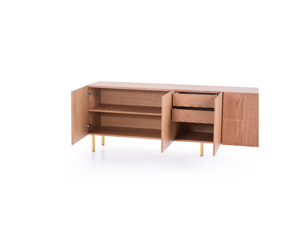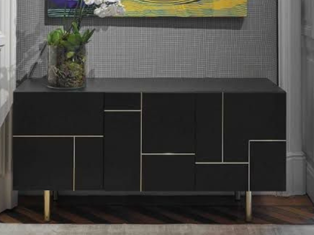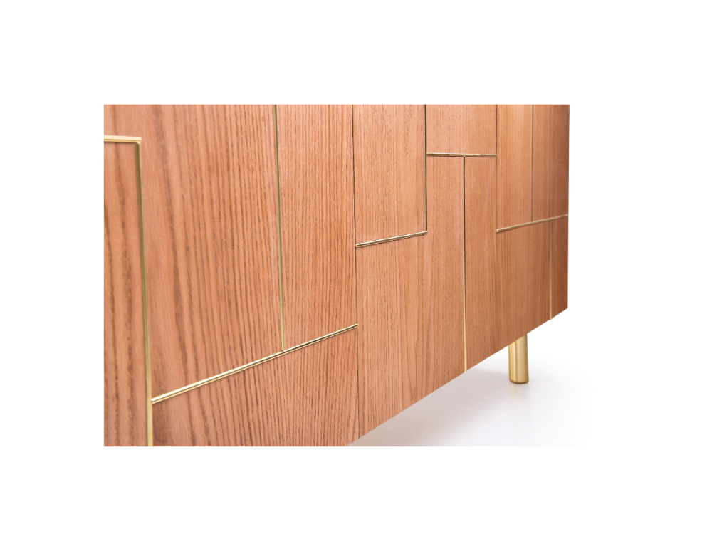 As linhas do buffet labirinto criam um efeito Mondrian, peça assinada por Nada Se Leva. O resultado é uma peça limpa, porém rica em detalhes.
