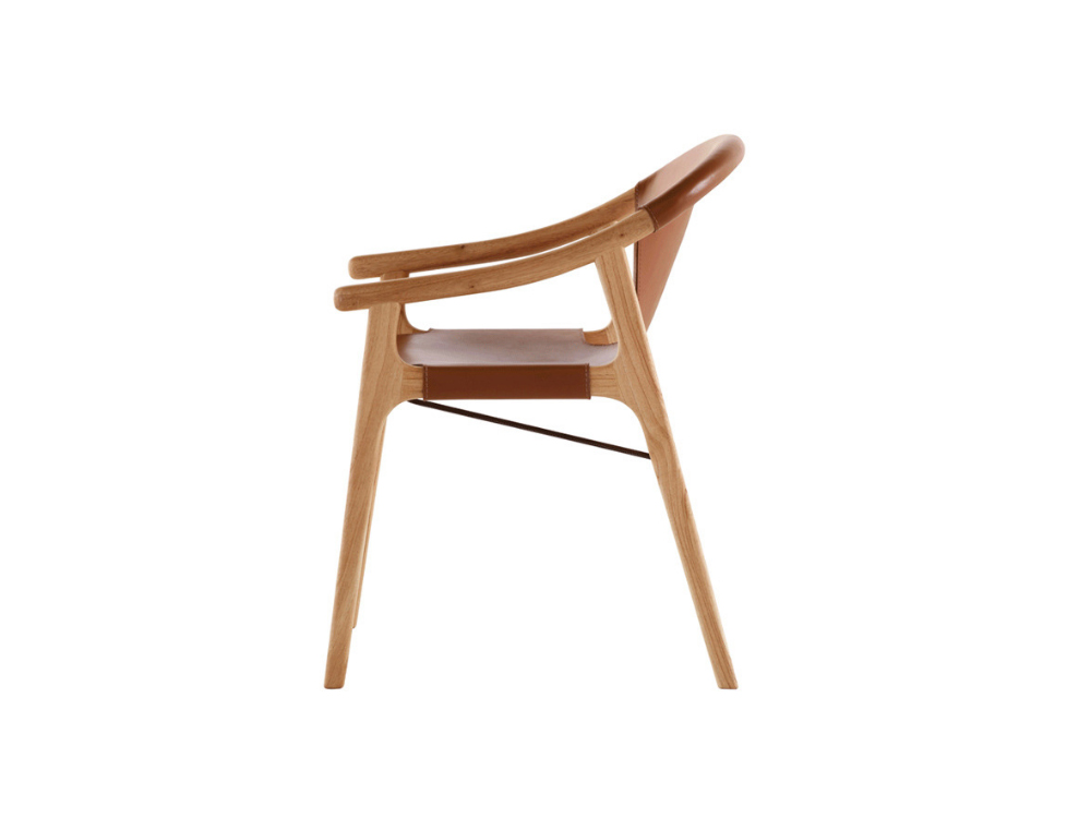 A curva de apoio dos braços, que ao mesmo tempo serve como travamento do encosto, evidencia a estrutura de madeira. Uma única peça de couro dá forma para encosto e assento, fazendo referência ao berço. Outro detalhe que traz sofisticação é o travamento metálico dos pés. Em diferentes acabamentos, resulta em uma peça versátil para atender diferentes estilos de públicos.