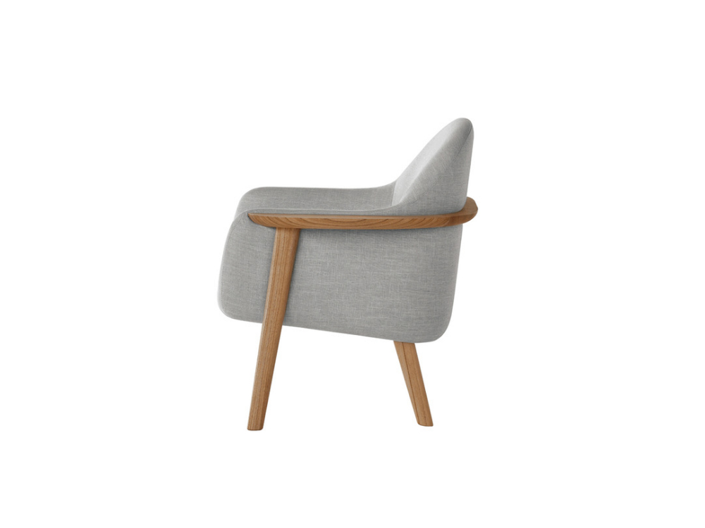 Com proporções para ser encaixada em ambientes de todos os tamanhos, a poltrona exibe braços de madeira que circundam o assento. A superfície macia dos estofados em formato de concha acomoda o corpo de maneira natural.